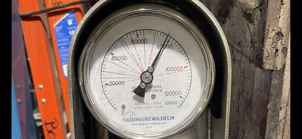 All of the structural bolt grades listed above have a required minimum tension they are supposed to meet when tightened. Using a Skidmore-Wilhelm Bolt Tension Measuring Device, in conjunction with the AISC Research Council on Structural Connections (RCSC) specification, the bolts can be tested to verify that upon tightening, those minimum tension values are met.